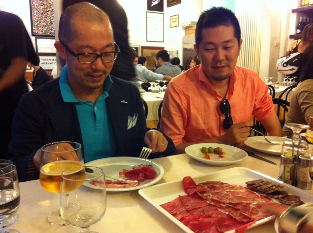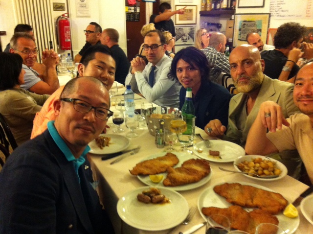 ミラノでいつも怖いもの見たさに行くトラットリアにエストネーションのバイヤー原さん、小林さん、ガブリエレパシーニさん、弊社営業の安部と一緒に行ってまいりました。