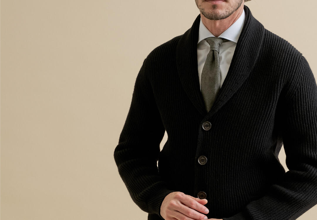ブランド定番のショールカラーニットから、従来モデルのローゲージに加え、新たにミドルゲージが登場しました。