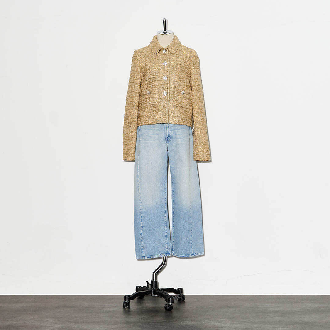 ゴールドがかったツイードジャケットに、淡いブルーのデニムを合わせたミックススタイル。