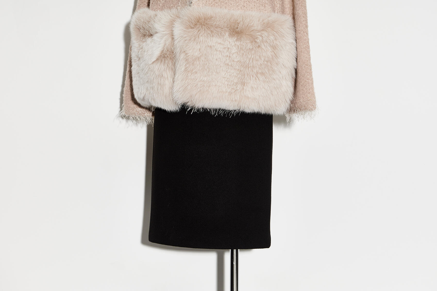 ふっくらとした重厚感のあるタイトスカートを合わせた穏やかなトーンのスタイル。